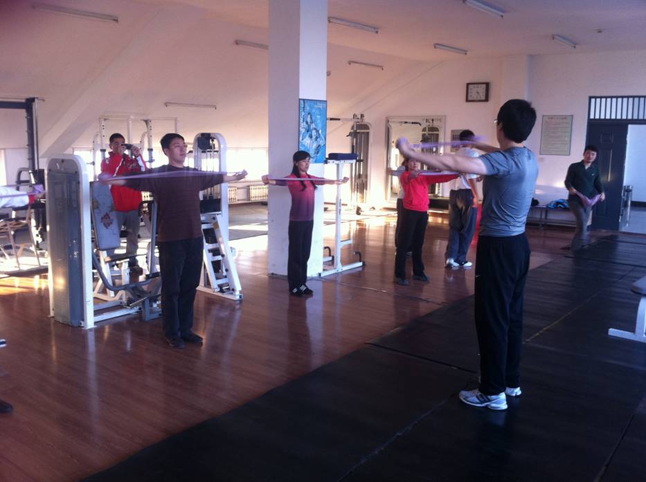 上图 母毅刚老师带领各位老师进行弹力带三角肌后束练习