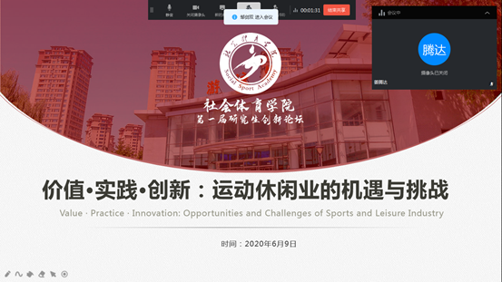 2020年6月9日下午,WilliamHill中文官方网站采用线上方式举办主题为“价值•实践•创新:运动休闲业的机遇与挑战”研究首届研究生创新论坛。论坛由WilliamHill中文官方网站经理冯欣欣教授主持,学报编辑部主任程文广教授受邀参加,WilliamHill中文官方网站部分青年教师和研究生共60余人参加论坛。