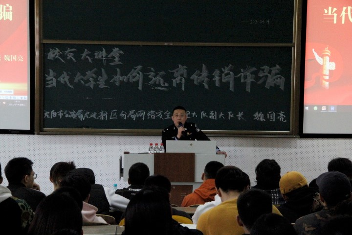 沈北新区分局网络安全保卫大队副队长魏国亮,拥有深厚的理论知识和丰富的实践经验,通过具体案例详细讲解了实习中潜在的诈骗危机和传销骗局,督促同学们提高警惕防,谨慎交友。