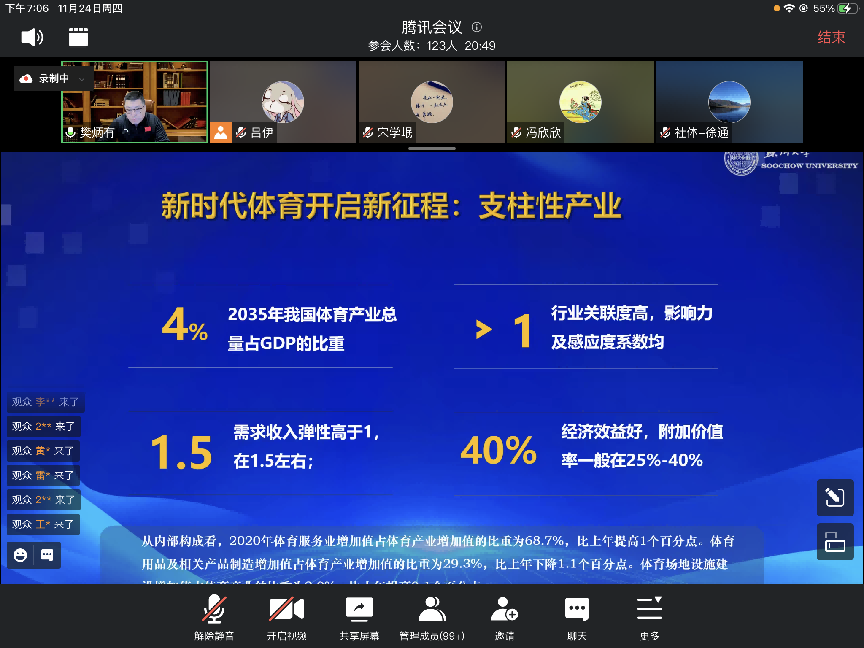 樊炳有教授讲述全民健身公共服务体系是为了推动落实全龄友好理念,普及全民健身文化。塑造人人关系支持全民健身公共服务体系建设,人人积极参与体育锻炼的社会氛围。同时对我国目前体育赛事的推动进程和大众健身的发展情况进行介绍。