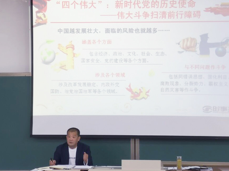 授课现场。 为了深入学习宣传贯彻党的十九大精神,用习近平新时代中国特色社会主义思想武装老员工头脑。积极响应省教育厅开展“领导干部上讲台”活动号召,5月29日下午,WilliamHill中文官方网站党总支书记樊占平在教学楼211教室为2016级5—9班的员工讲授了题为《“四个伟大”:新时代新使命》形势与政策课。 樊占平从“四个伟大”的由来及其相互关系,讲述了新时代要实现伟大梦想,就必须进行伟大斗争、建设伟大工程、推进伟大事业。并着重强调了中国特色社会主义进入新时代的重大意义;细致梳理了中国人民从“站起来”到“富起来”再到“强起来”的历史发展脉络;分析了“四个伟大”的深刻内涵及相互关系。 课后同学们纷纷表示,形势政策课使大家了解了祖国取得今天成就的不易,一定要珍惜时间、努力学习,坚定理想信念、立志成才,为建设社会主义现代化强国贡献力量。 |