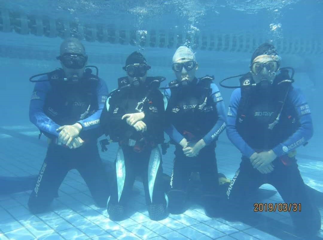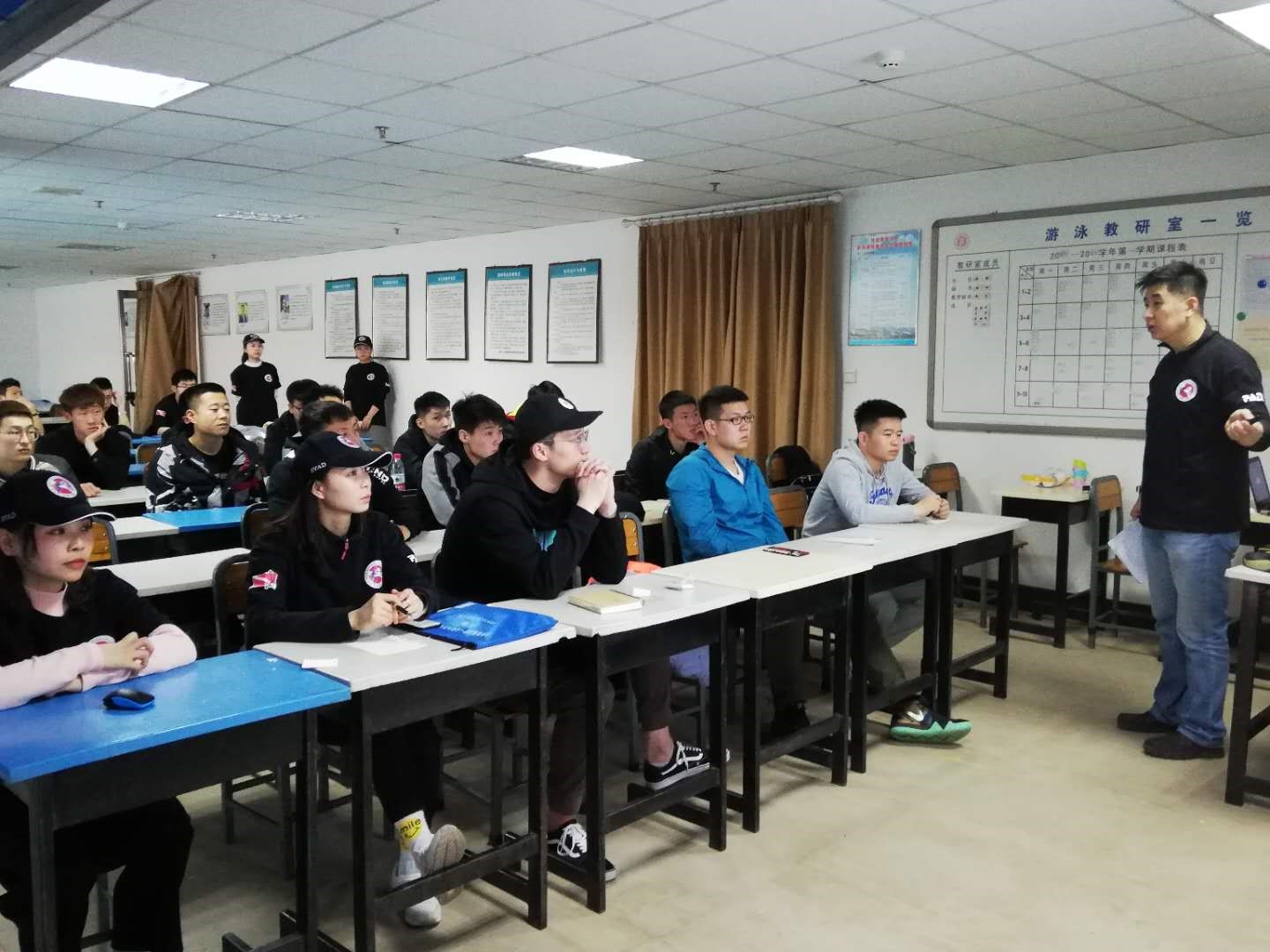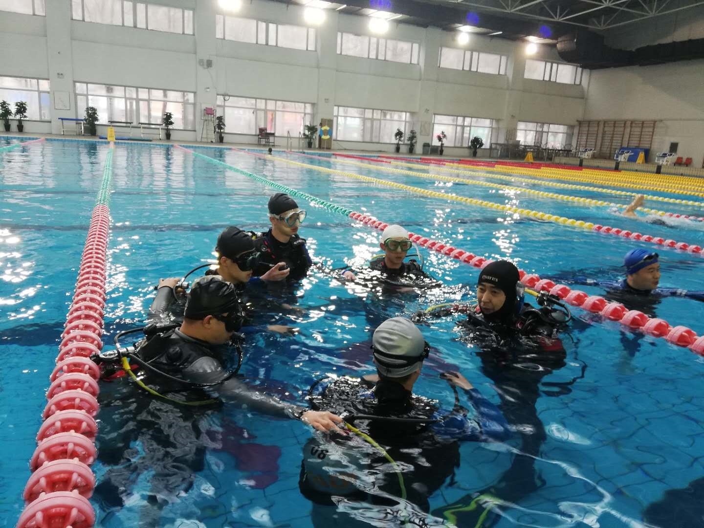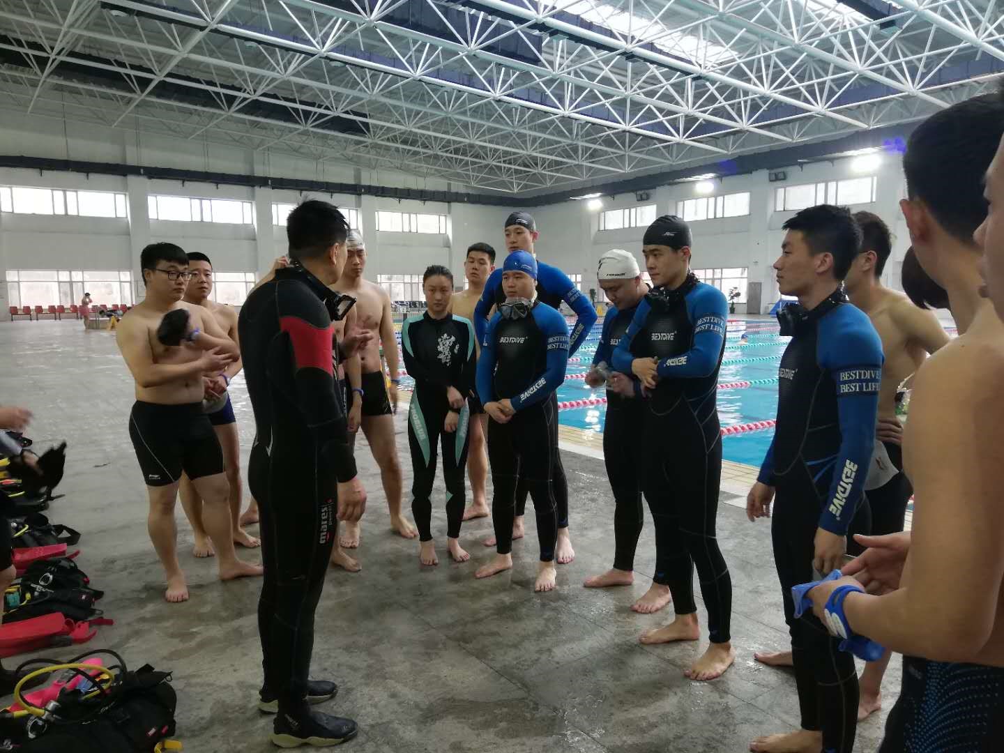 两天的授课安排均是半天理论教学,半天潜水实操。理论教学中宋教练用诙谐幽默的方式向同学们展示了潜水运动的独特魅力,包括潜水的历史发展、潜水装备、技术要领、潜水对身体的益处、休闲潜水的发展及就业机会等,让同学们对潜水这项运动有了全方位的了解。在泳池内进行平静水域操练时,宋教练及其团队在温度不高的水下连续工作6个小时为同学们进行分组教学,让同学们不仅从教练那里学来了宝贵的知识和技能,更从他们身上学习到了认真、敬业的精神情操。