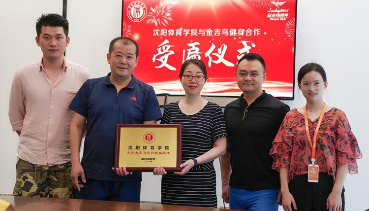 樊占平(左二)为金吉鸟健身实习实训就业基地授匾
