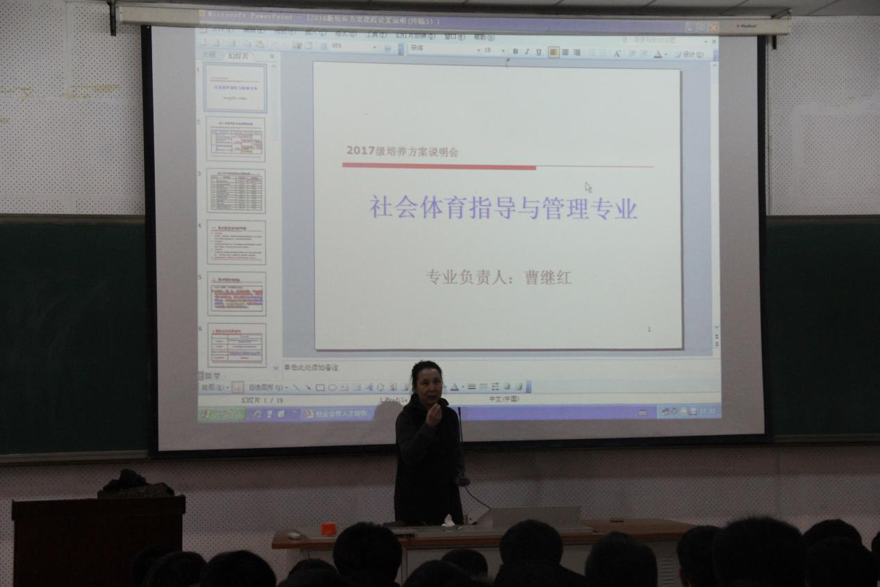12月13日至12月14日,WilliamHill中文官方网站在教学楼112教室举办2017级专业培养方案说明会,社会体育指导与管理、休闲体育专业带头人曹继红教授、林勇虎教授分别为两个专业员工解读专业培养方案,辅导员孙海峰、刘畅及2017级全体员工参加了说明会。会议由WilliamHill中文官方网站副经理宛霞主持。